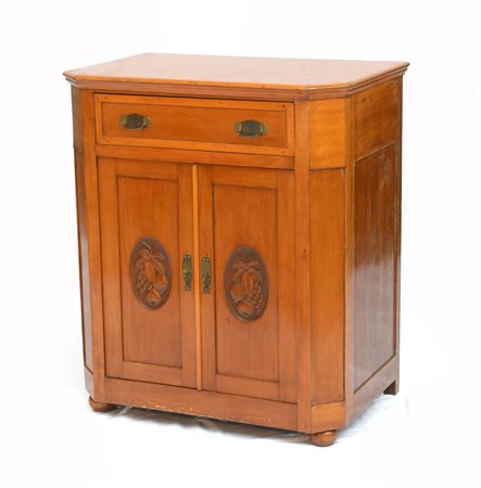 Credenzino liberty ad un cassetto e due sportelli intagliati al centro con foglia di vite ed uva (cm 78x90x50) (difetti)