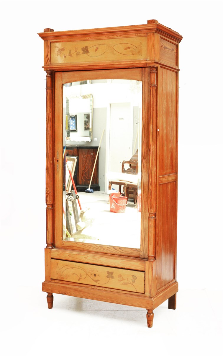 Armadio ad un'anta a specchio ed un cassetto decorato a motivi floreali. Montanti a colonna scanalata. Piedi anteriori torniti (cm 95x205x50) (difetti)