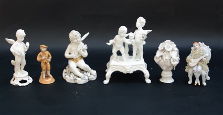 Lotto composto da cinque sculture in porcellana raffiguranti amorini e figure maschili e un piccolo vaso con fiori (h max cm 15) (difetti e mancanze)