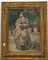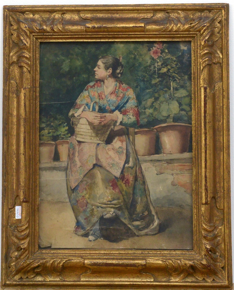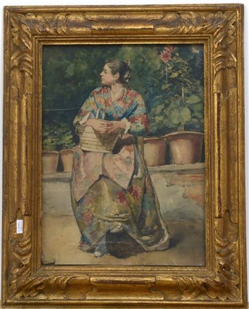 Scuola del secolo XIX "Ritratto di donna in un giardino" acquerello su carta (cm 38x28) In cornice (difetti)