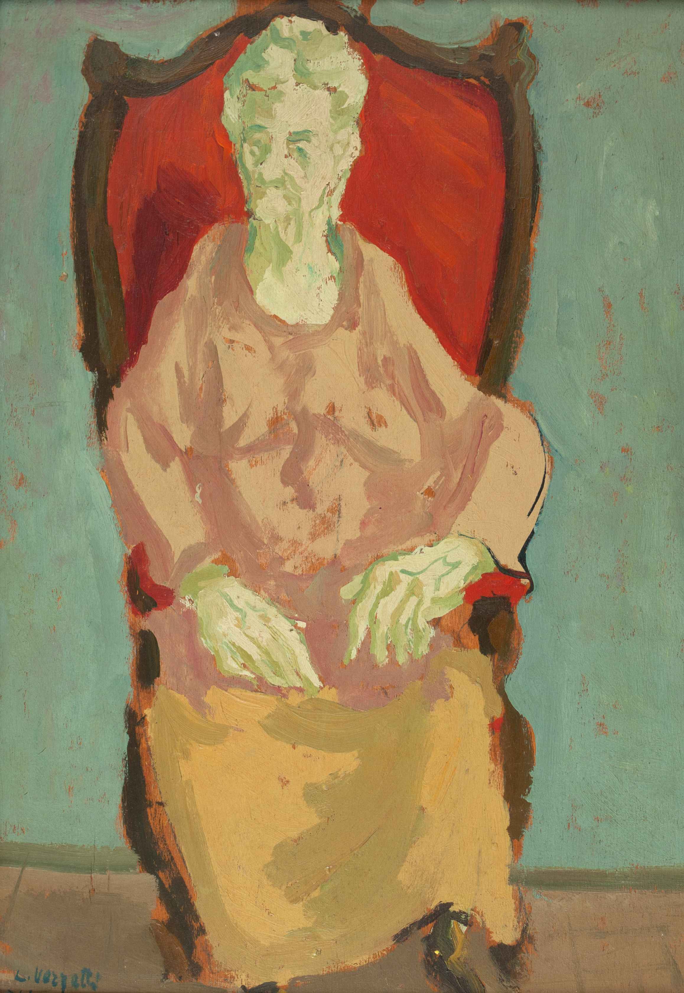 LIBERO VERZETTI Vecchietta su poltrona rossa 1944 olio su tavola cm 38x 27...