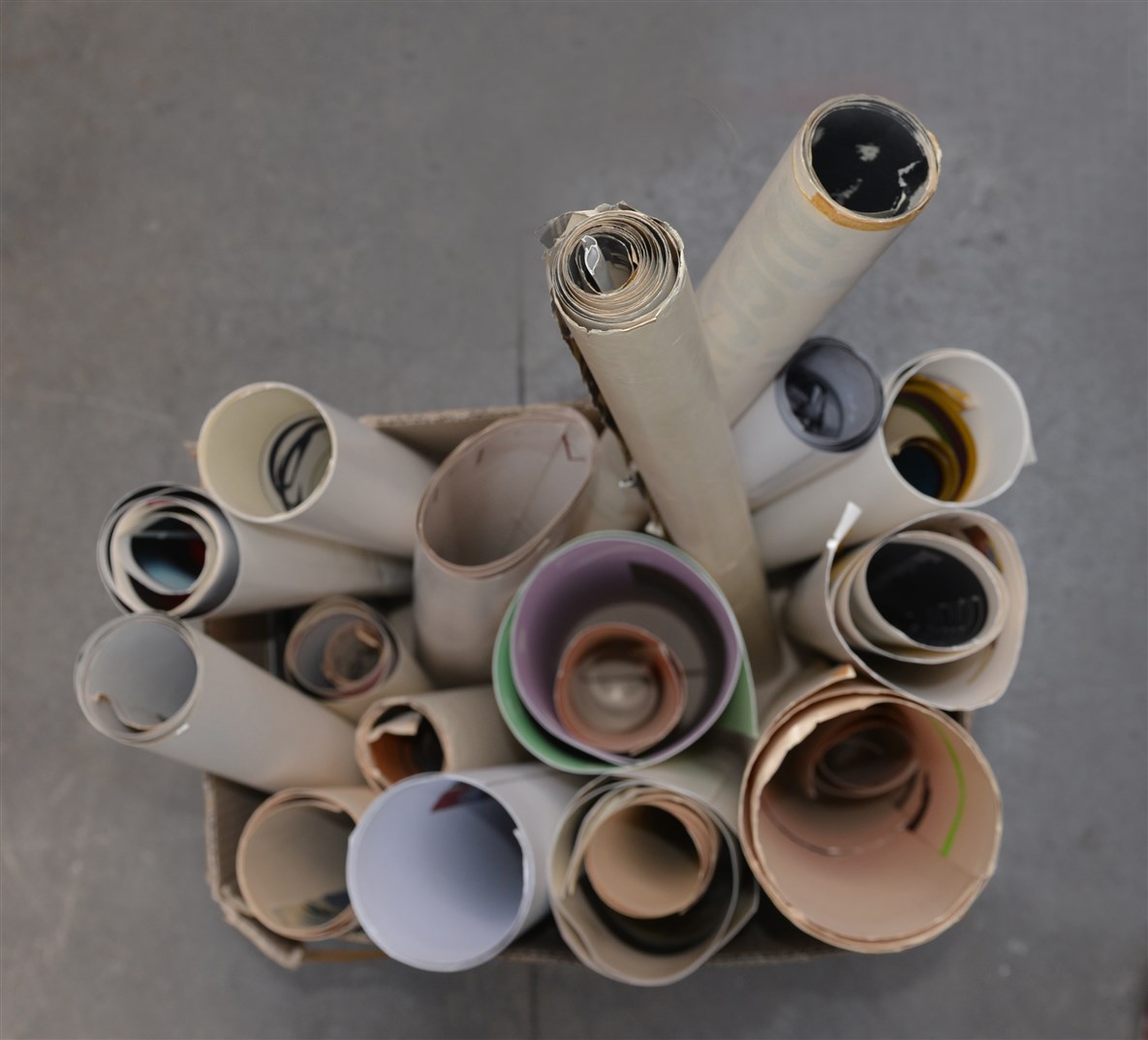 Cartone contenente numerosi poster espositivi e manifesti tra cui "Aus der Mechanischen Stadt" Zurigo 1965, "Picasso Avignon Prolongation" Avignone 1973, Ed. Mourlot, "Lettera 32 Olivetti per tutti" 1968, illustrato da Jean Michel Folon e un poster litografico edito dalla Libreria Feltrinelli con un'opera di Roy Lichtenstein