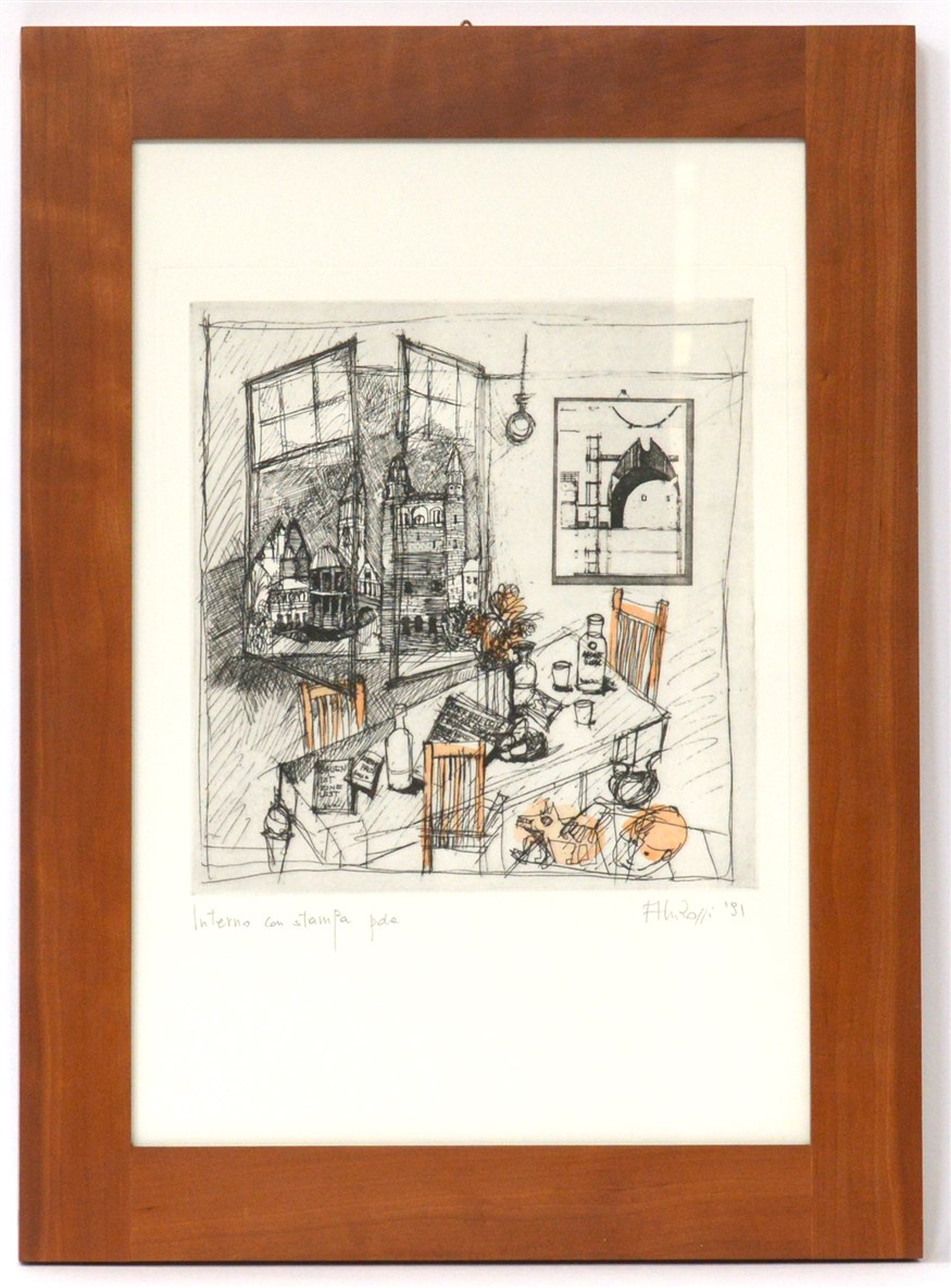 Lotto 3365 | Aldo Rossi "Interno con stampa" 1991 acquaforte - prova d'artista (lastra cm 29x