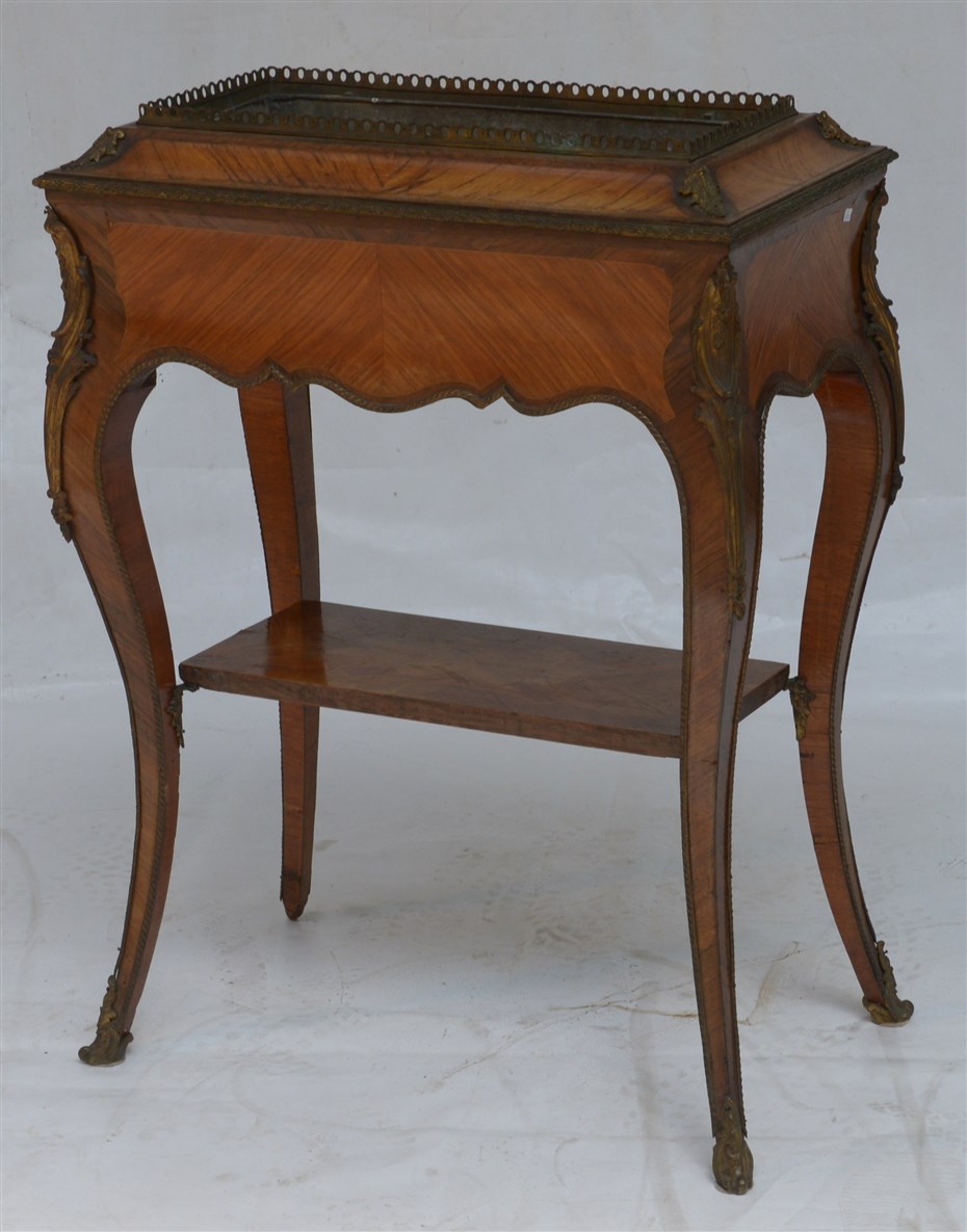 Mobiletto-fioriera da centro interamente lastronato e filettato, fascia sagomata, gambe mosse, profili e guarnizioni in metallo, pianetto asportabile (cm 60x82x35) (difetti e mancanze)