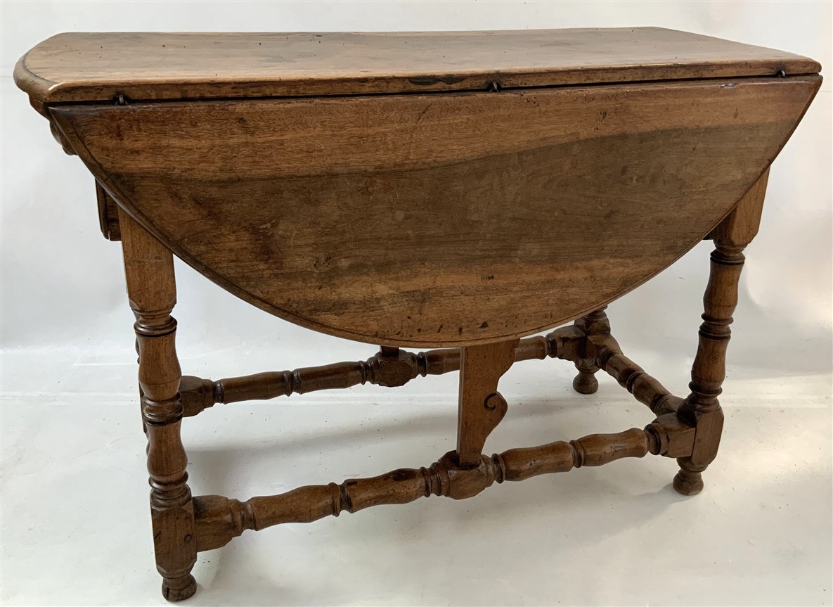 Tavolo ad alette ad un cassetto sottopiano con gambe e traverse tornite (cm 100x63x38) Secolo XIX (difetti)