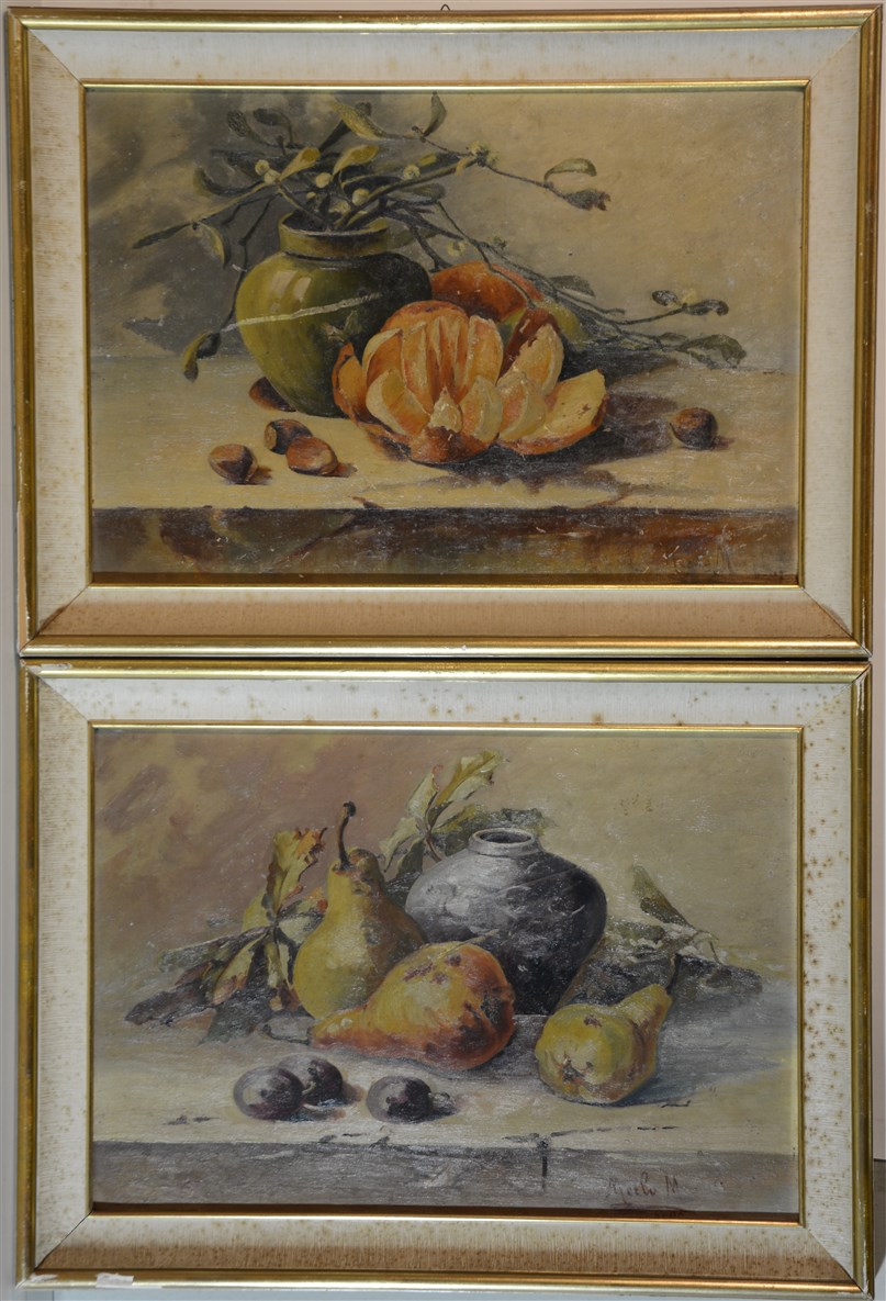 M. Merlo Coppia di nature morte con frutta, olio su cartone (cm 34,5x49) firmati