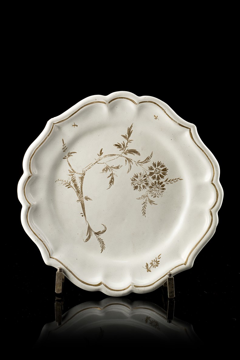 Manifattura di Felice Clerici, Milano, 1760/80. Piatto in maiolica di forma polilobata a quattro punte con decorazione in monocromia oro su smalto bianco con un motivo di ispirazione orientale a sinuosi rami con fiori a corolla aperta (d. cm 20) (sbeccature e usure all'oro)Per confronto si veda: Saul Levy, 'Maioliche Settecentesche Lombarde e Venete', tav. 68B, Gorlich, 1964