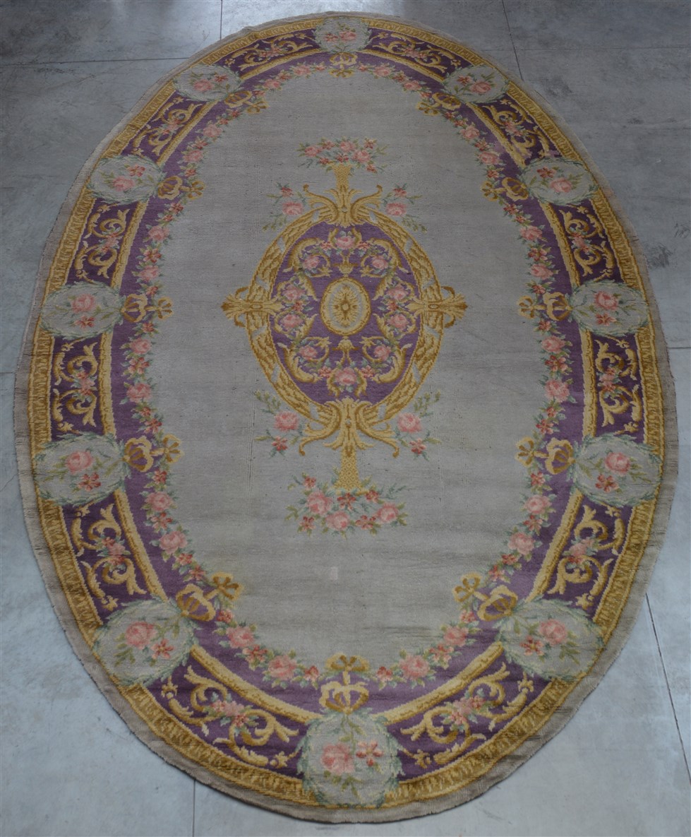 Tappeto tipo Savonnerie di forma ovale, Europa, metà secolo XX. Decoro con meda