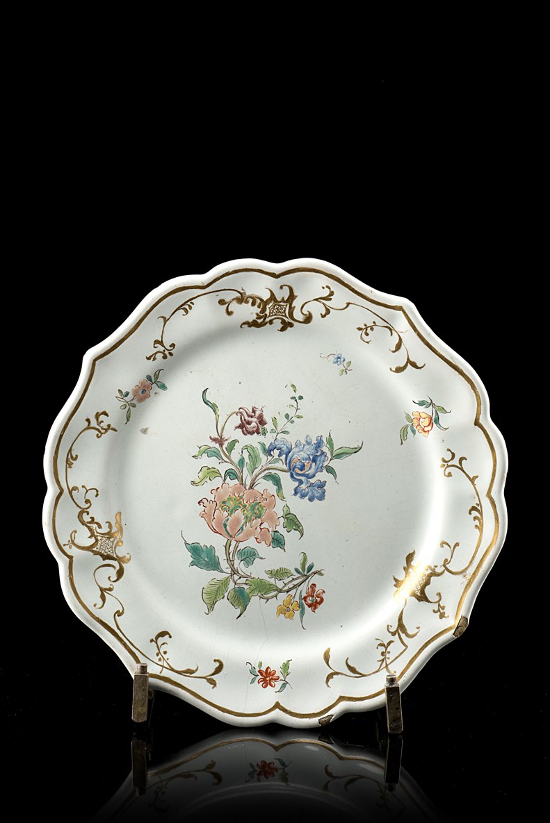Manifattura di Felice Clerici, Milano, 1760 circa. Piatto polilobato in maiolica con bordo leggermente rilevato e impreziosito da un elegante motivo rocaille in oro che forma tre riserve a graticcio. Al centro è dipinto un mazzo di fiori composto da peonie e tulipani di derivazione orientale (d. cm 20 circa) (felatura e sbeccatura)