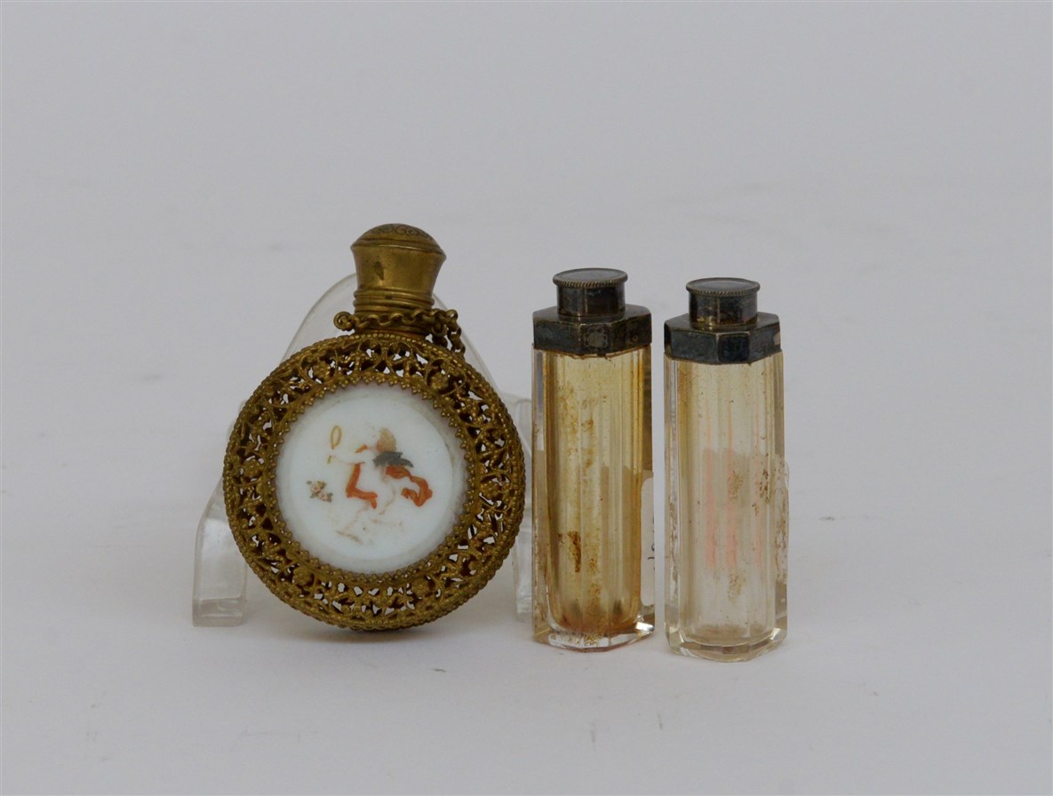 Lotto composto da tre bottiglie di diverso uso, due con ghiera in argento. Epoche diverse (difetti alla doratura)