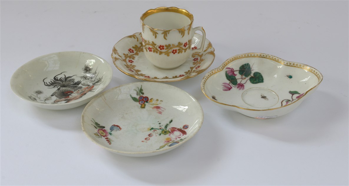 Manifatture diverse, secolo XVIII/XIX. Lotto composto da una tazza con piattino e tre piattini in porcellana a decori policromi e dorati (difetti e restauri)