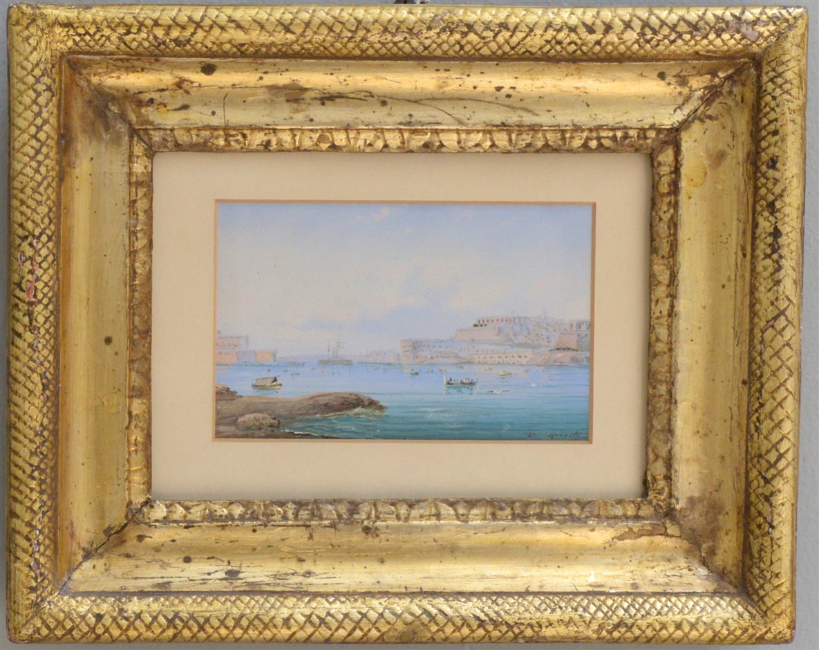 "Scorcio del golfo di Napoli" tecnica mista (cm 8,5x13) Firmato in basso a destra. In cornice