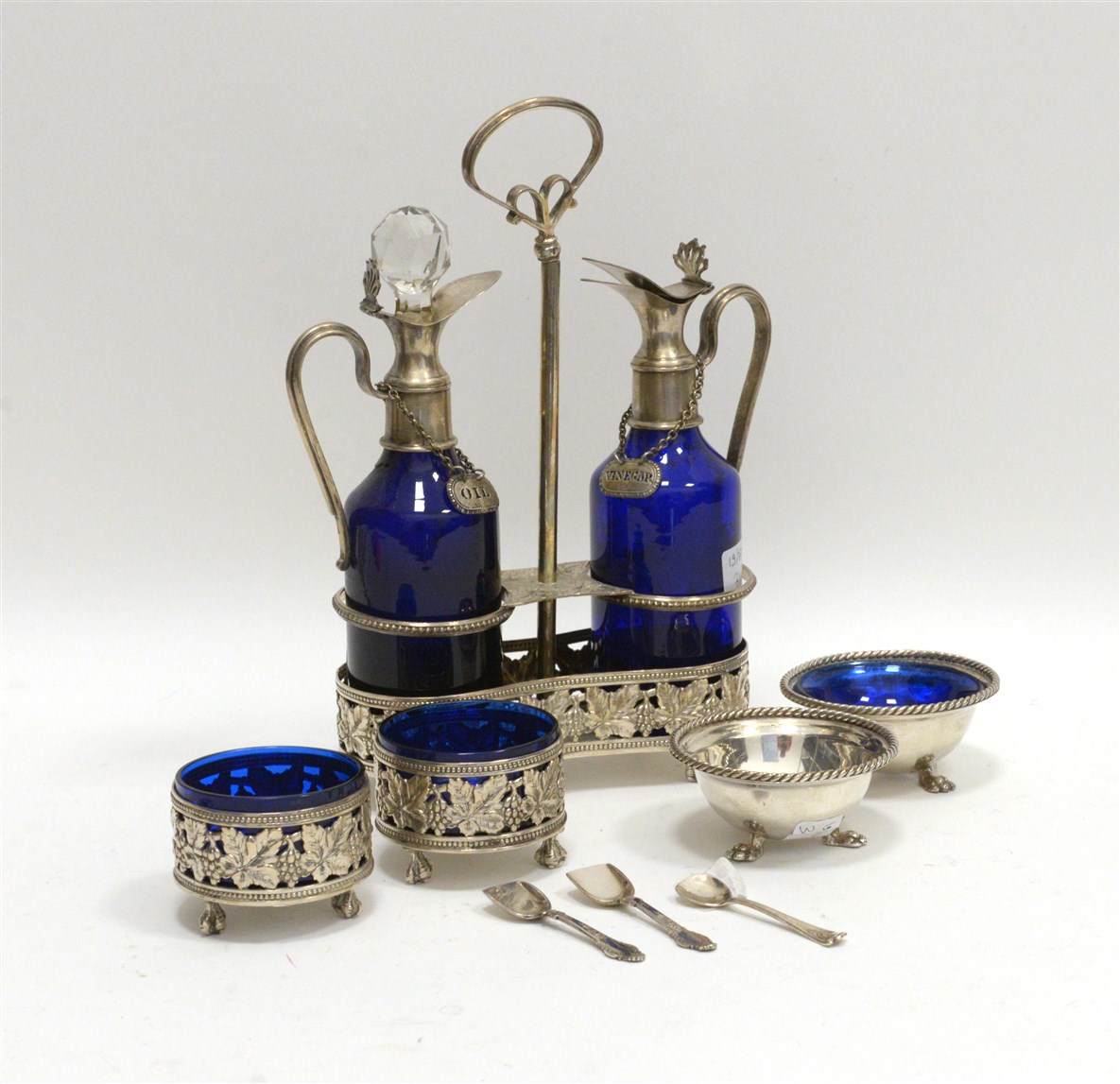 Lotto composto da un cruet in argento e due salierine con ghiera traforata decorata a tralci di vite, vaschette e contenitori in vetro blu; unite a una coppia di salierine in argento di forma circolare. Tre cucchiaini non pertinenti. Titolo 800 (g tot. 529 ca.) (difetti, una vaschetta mancante)