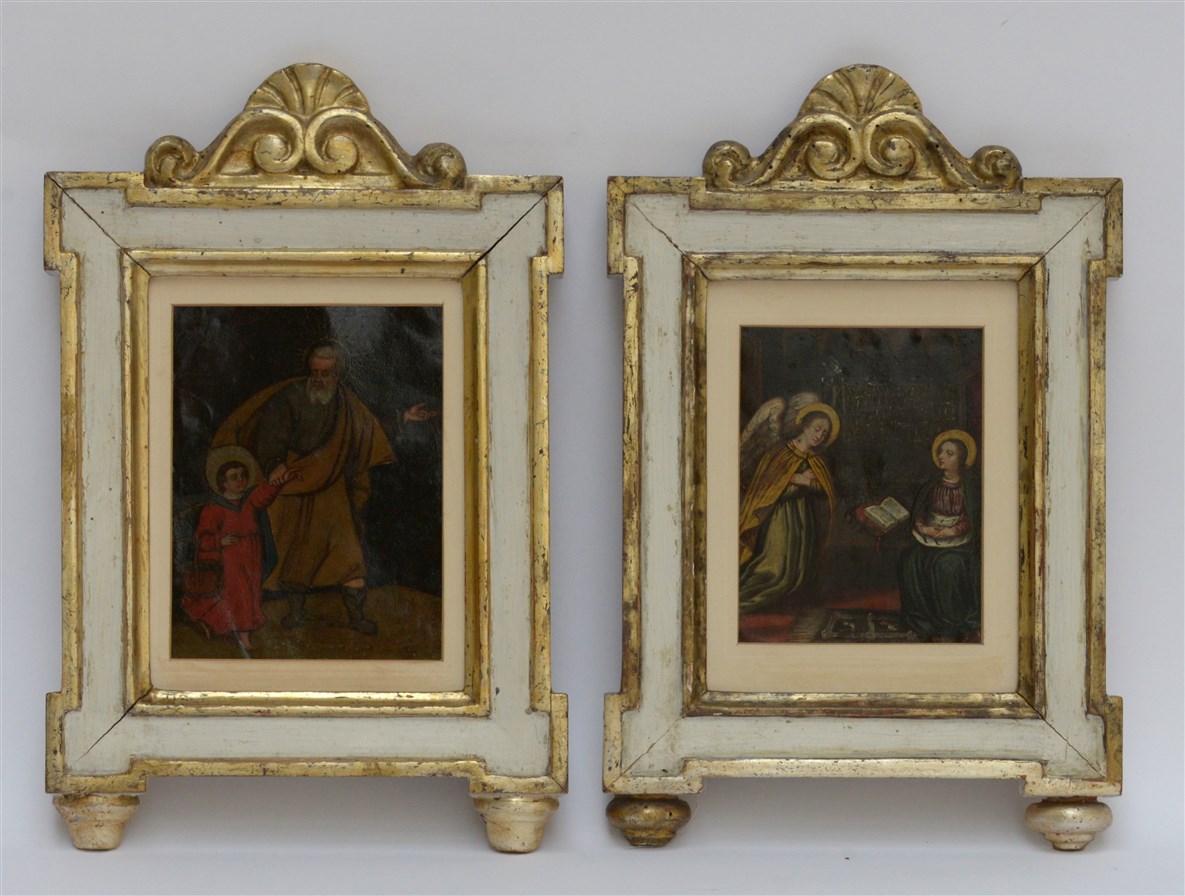 Ignoto "Annunciazione" e "San Giuseppe con Gesù Bambino" coppia di antichi dipinti ad olio su rame (cm 16x12) in cornici in legno dorato, intagliato e laccato del secolo XIX (difetti e restauri)