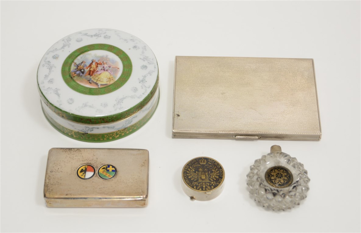 Lotto composto da due scatole in argento e tre oggetti diversi in metallo, vetro e ceramica (difetti)