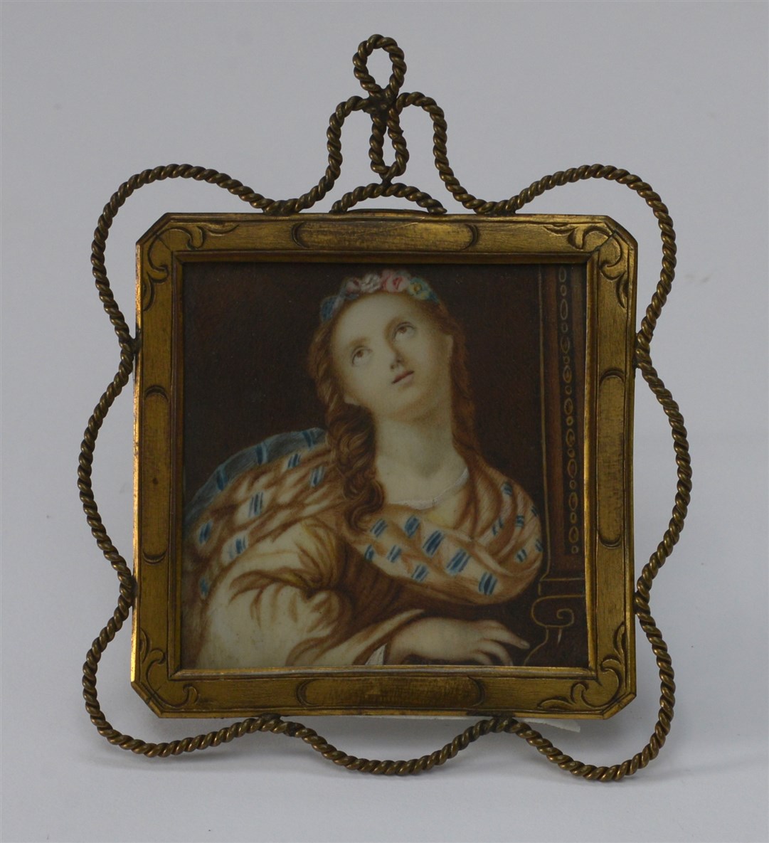 Scuola dell'inizio del secolo XIX "Gentildonna" miniatura su avorio (cm 7x7) in cornice in metallo dorato (difetti e restauri)