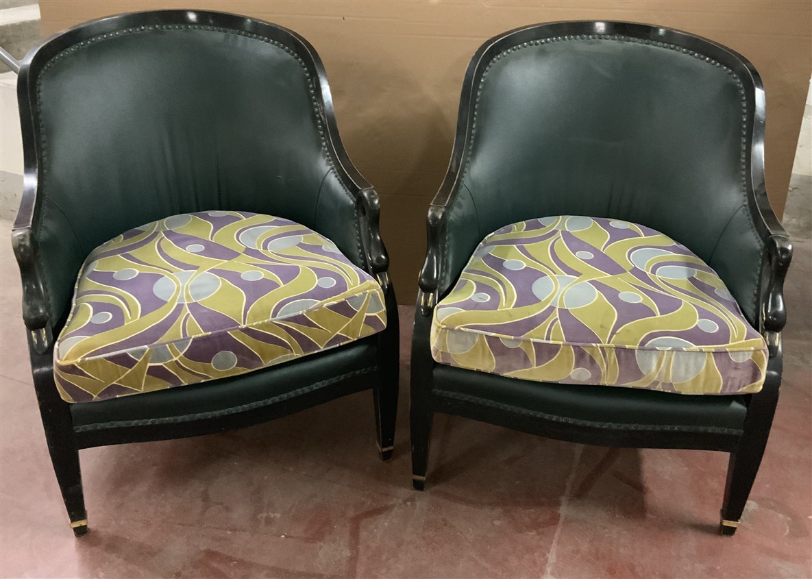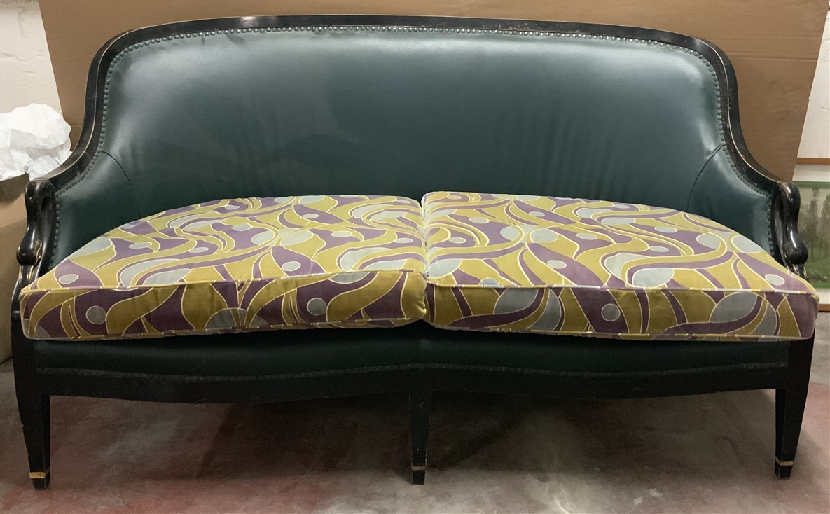 Fornitura da salotto composta da un divano a due posti e due poltroncine a pozzetto in legno intagliato e braccioli terminanti a testa di volatile con dorature. Ricoperti in similpelle verde scuro(poltrone cm 65x86x67