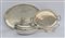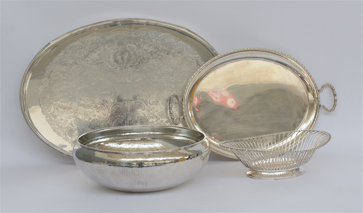 Lotto composto da due vassoi biansati, una grande ciotola e un cestino in metallo argentato di diverso decoro (difetti)