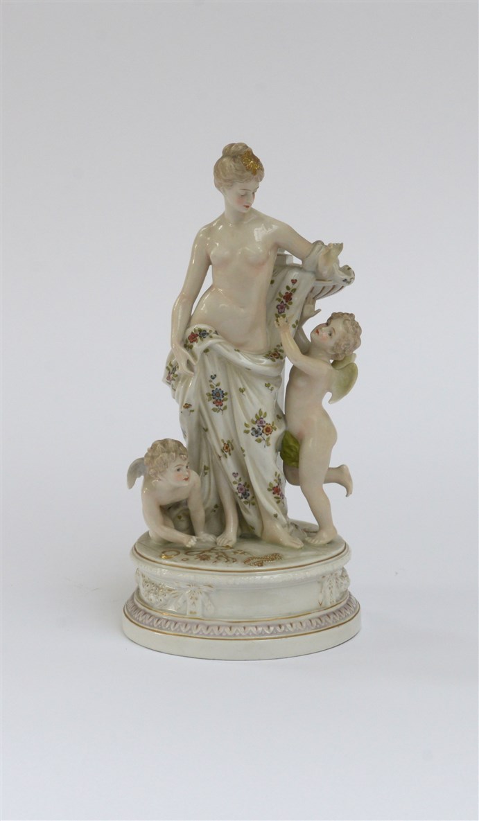 Manifattura del secolo XX. Gruppo in porcellana policroma raffigurante putti alati e figura femminile (h. cm 26) (difetti)
