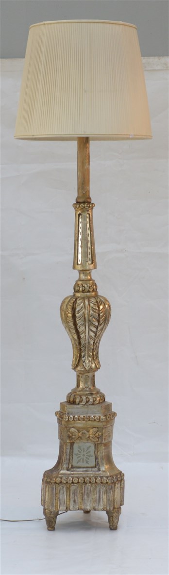 Candeliere da terra in legno intagliato e dorato a mecca, inizio secolo XIX (h cm 120) montato a luce elettrica in epoca posteriore, paralume in stoffa (h cm tot 186) (difetti)