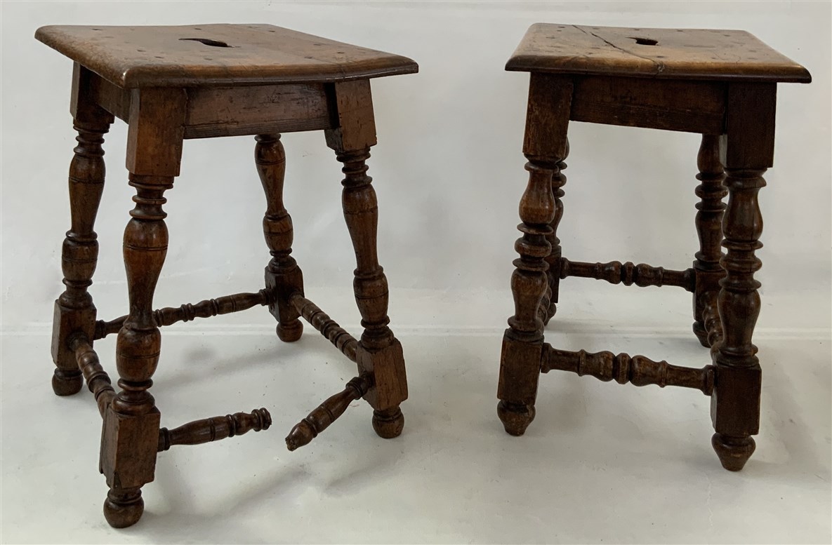 Coppia di antichi sgabelli "a rocchetto" con gambe e traverse tornite (cm 40x47x32) (difetti, rotture e restauri)