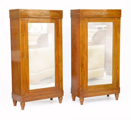 Coppia di armadi in ciliegio ad un'anta a specchio, fascia superiore decorata da fregio dorato, piedi torniti (cm 77x156x37) (difetti)