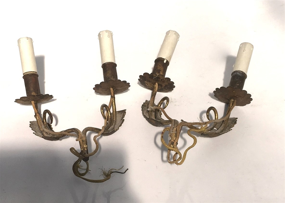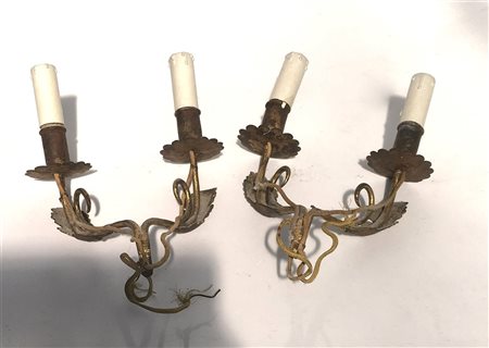 Coppia di appliques a due fiamme in metallo dorato. Secolo XIX (h. cm 28)