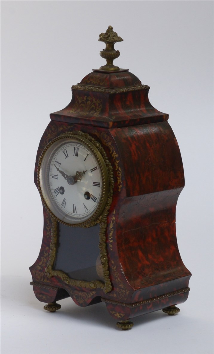 "Pendola da tavolo con cassa in legno lastronata in tartaruga intarsiata in ottone, quadranti in smalti a numeri romani. Francia, secolo XIX