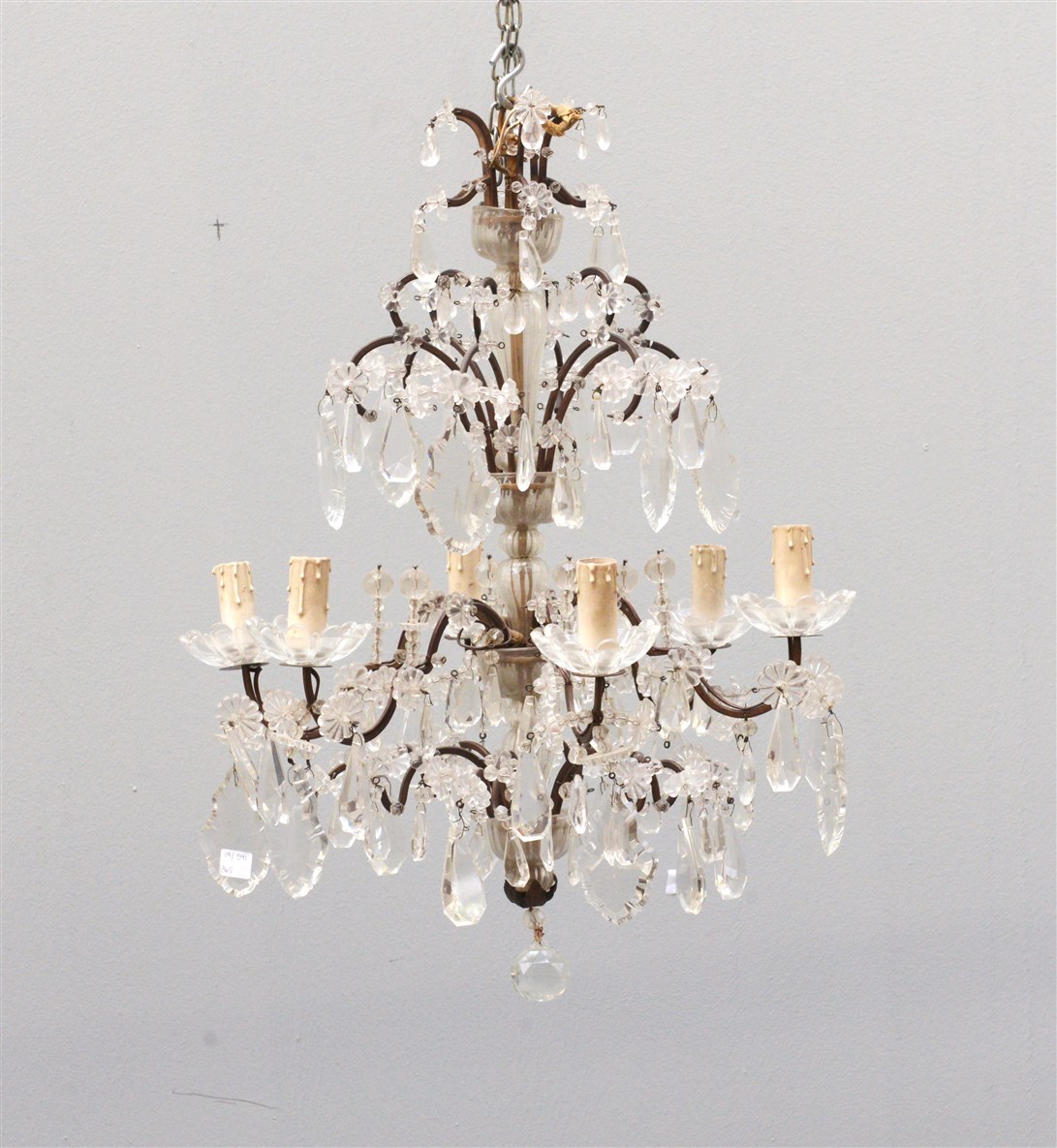 Lampadario a cesto con struttura in metallo a sei luci decorato da pendagli e g