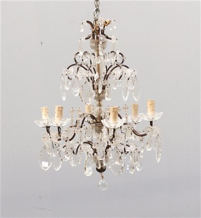 Lampadario a cesto con struttura in metallo a sei luci decorato da pendagli e gocce in vetro cristallo (h. cm 60) (difetti)
