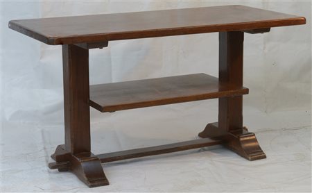 Tavolo rettangolare in legno con gambe a parallelepipedo riunite da pianetto (cm 145x78x68) (difetti)
