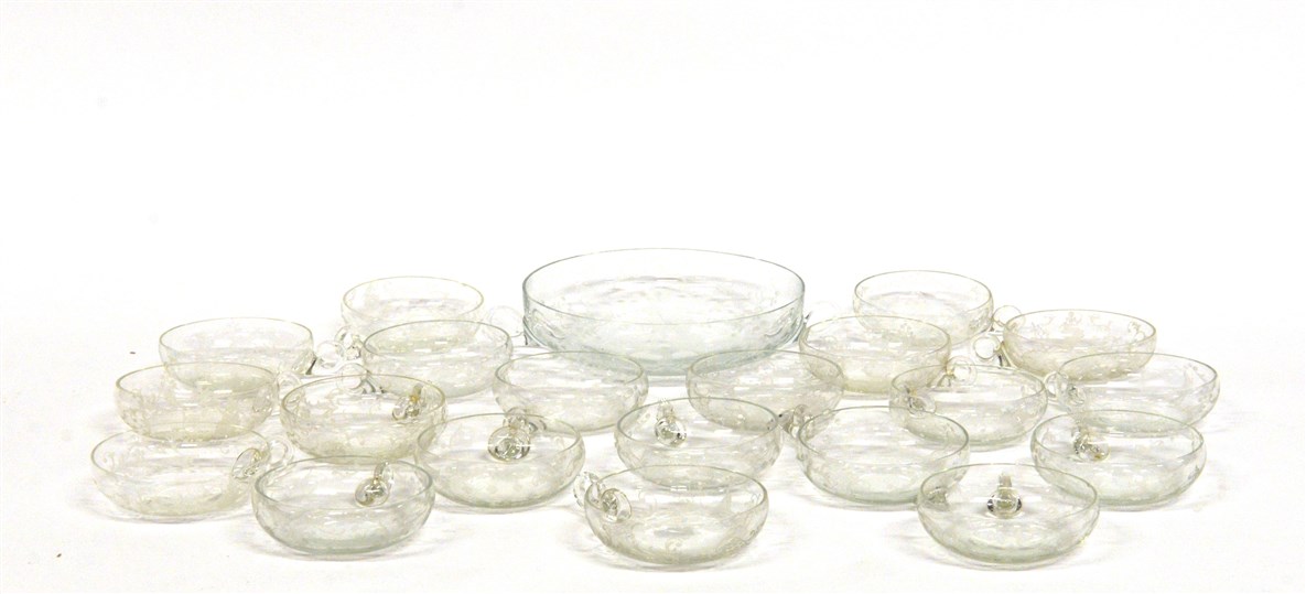 Servizio da dessert composto da venti coppette ed una ciotola biansata, in vetro incolore inciso con motivi floreali e dame (difetti)