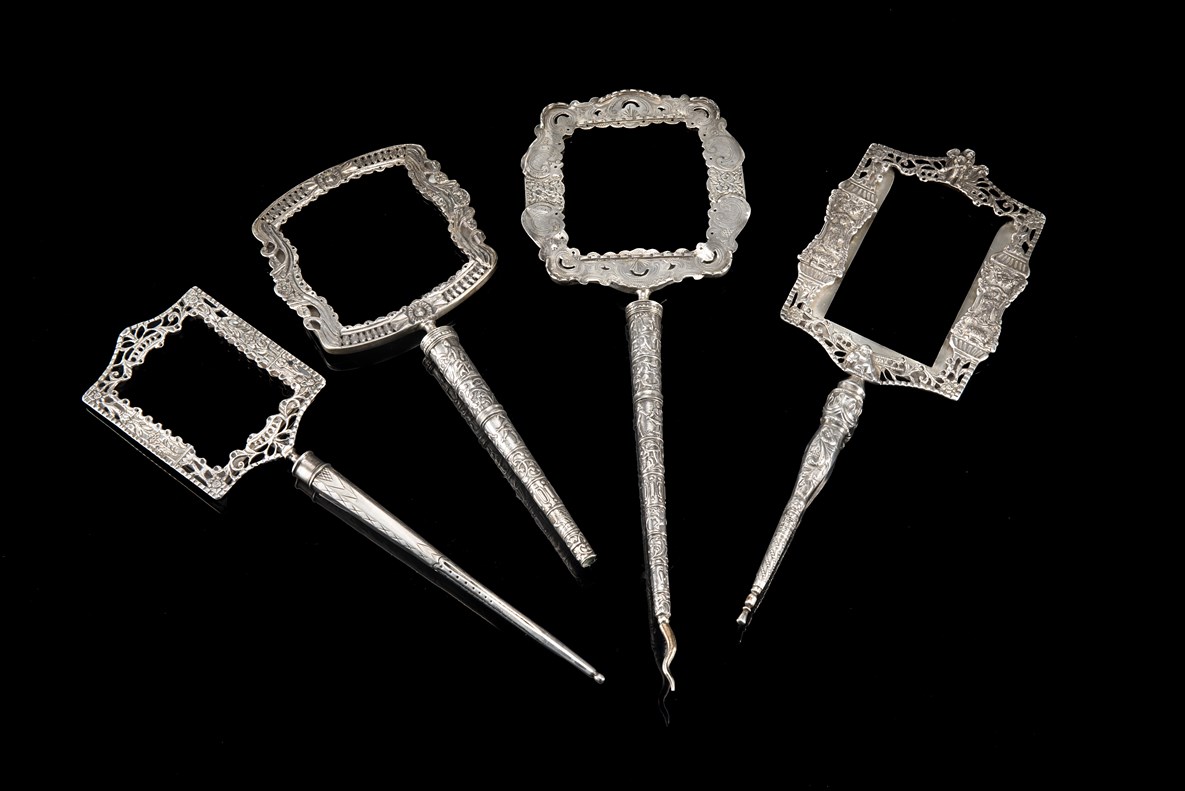 Gruppo di quattro ventole (?) in argento con manici decorati a scene di vita, putti e motivi stilizzati. Secolo XIX (cm max 30) (g 318 ca.) (difetti)