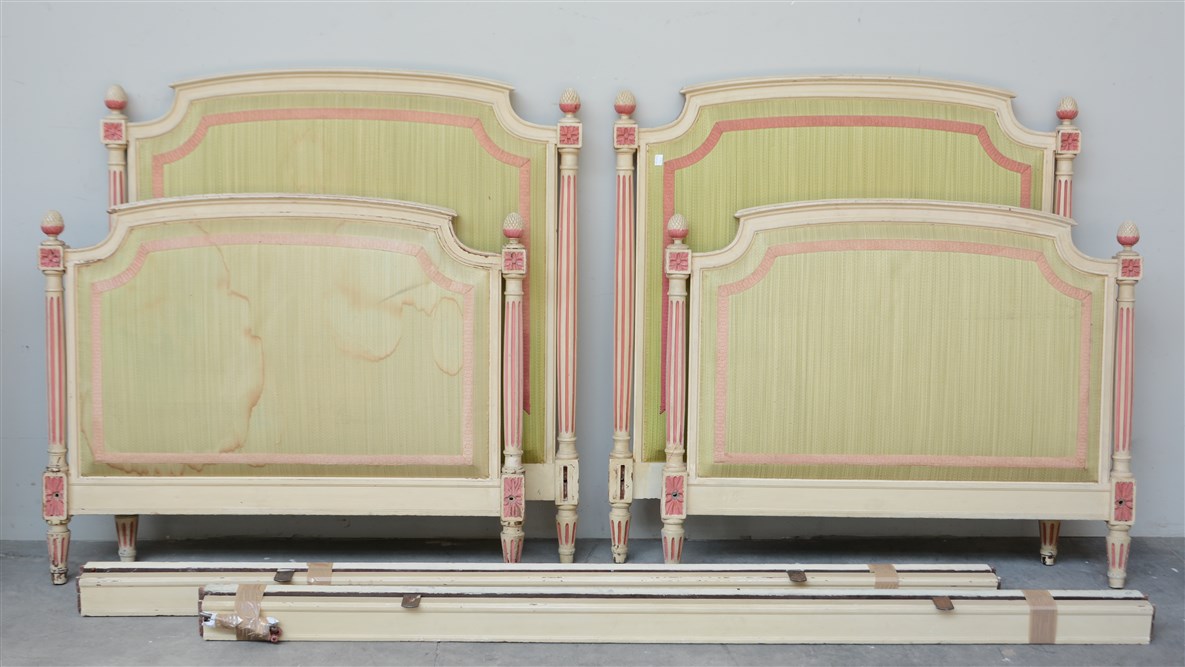 Coppia di letti singoli in legno laccato con testate e pediere rivestite in tessuto (difetti)