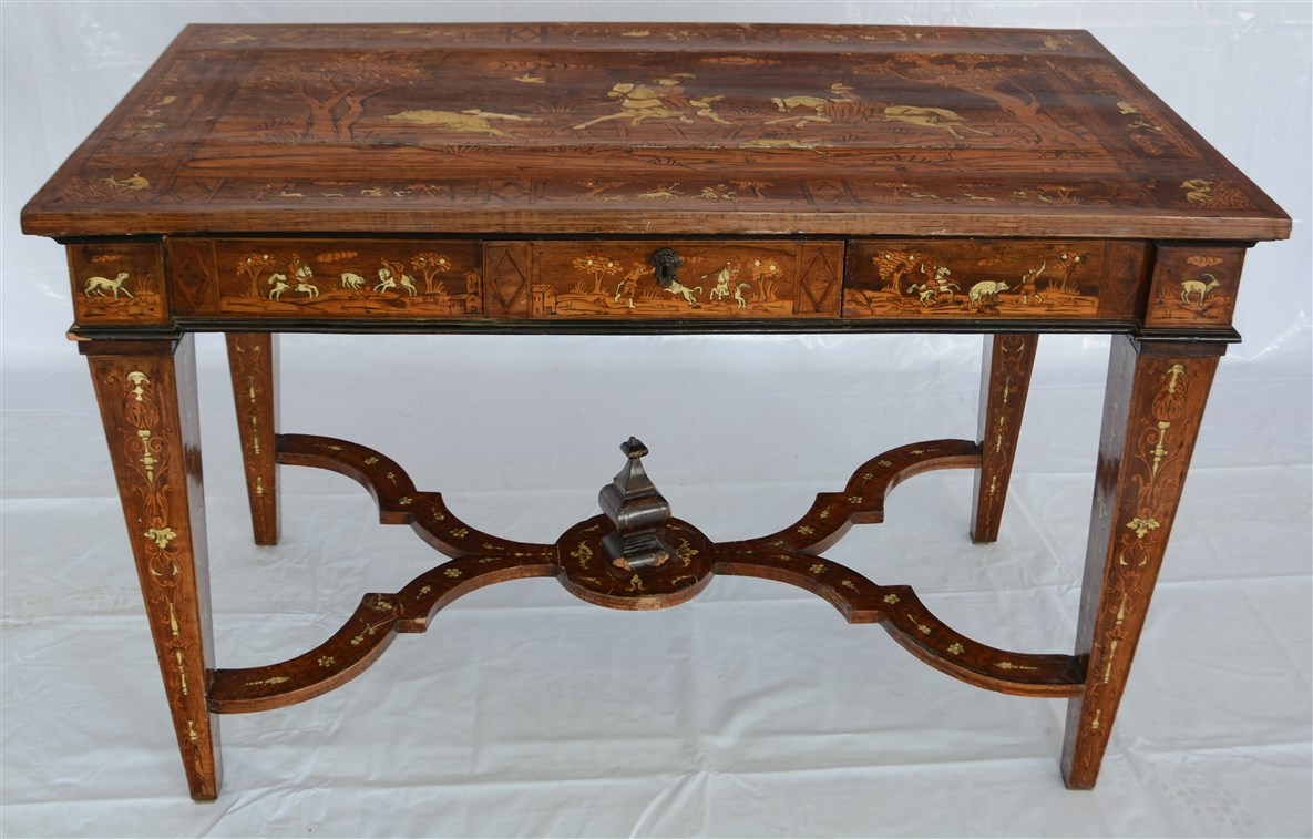 Scrivania ad un cassetto intarsiata in osso e legni vari a scene di caccia, gambe rastremate riunite da traversa (cm 128x81x73) (difetti)
