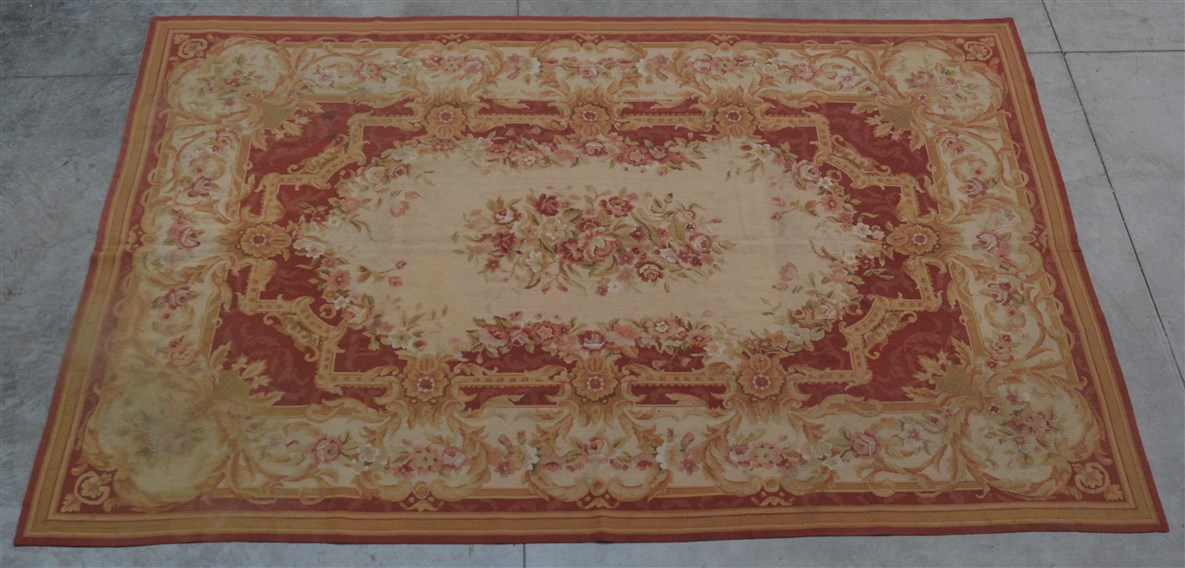 Tappeto piccolo punto in stile Aubusson in lana di moderna manifattura decorato con un medaglione floreale su fondo crema, cornice con fregi color oro (cm 262x168) (difetti e macchie)
