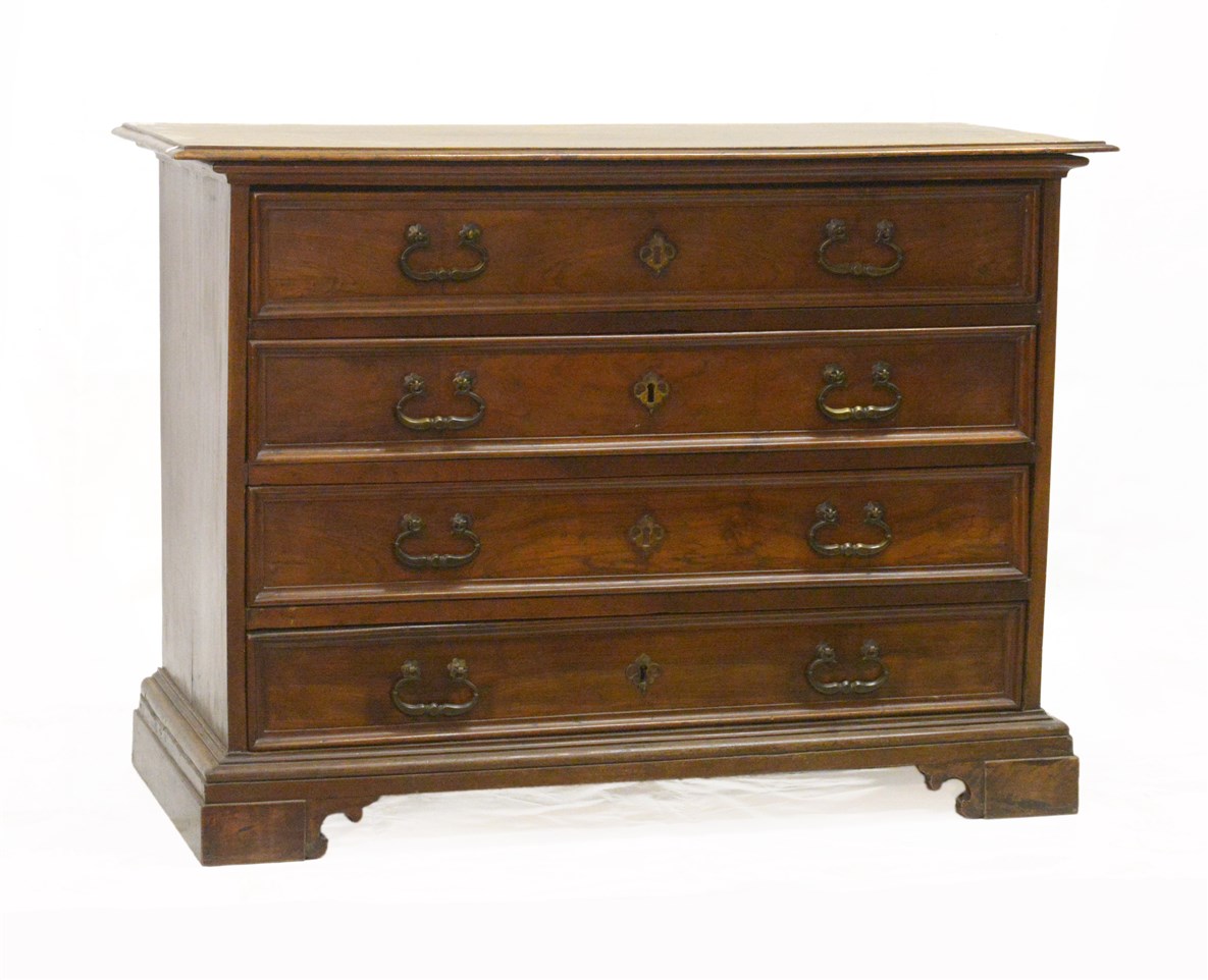 Lotto 3682 | Cassettone in noce a quattro cassetti con maniglie in bronzo, piedi a mensola.