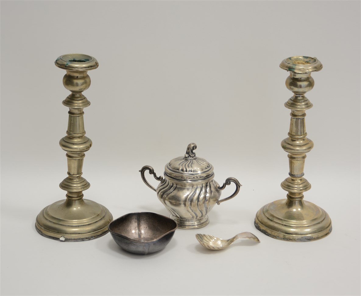 Lotto composto da una coppia di candelieri, una zuccheriera e due oggetti diver