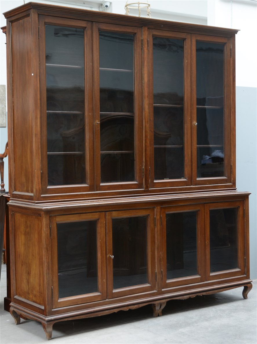Mobile libreria a due corpi, quattro ante a vetro nella parte superiore e quattro in quella inferiore, piedi sagomati (cm 217x253x62) (difetti)