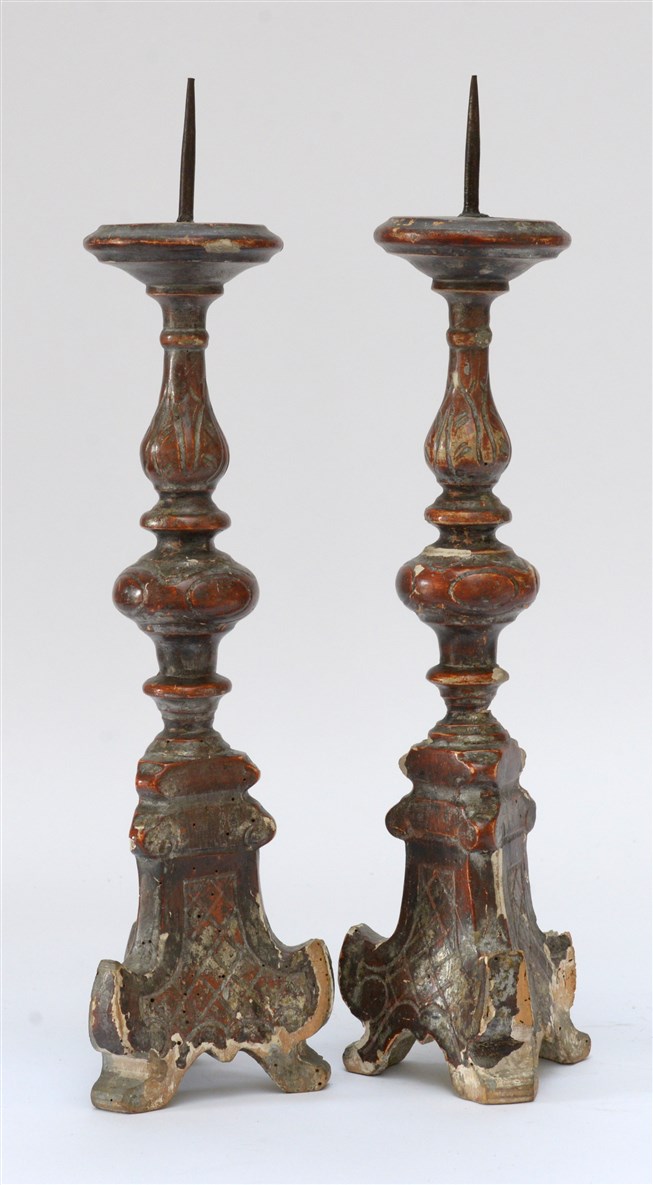Coppia di candelieri in legno intagliato e laccato con tracce di doratura a mecca, secolo XVIII (h cm 48) (difetti e mancanze)