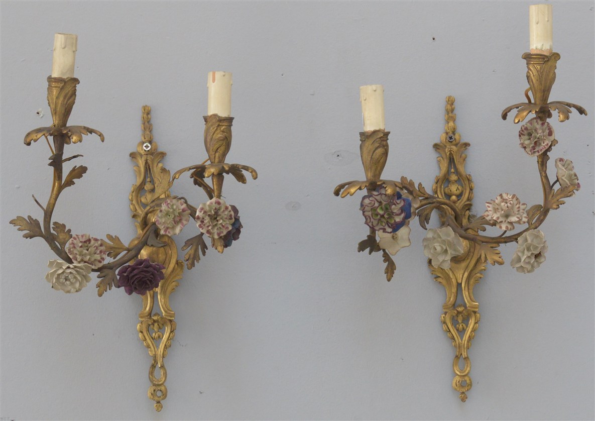 Coppia di appliques in bronzo dorato a due fiamme decorate con fiorellini in porcellana applicati (cm 40x28) (difetti)