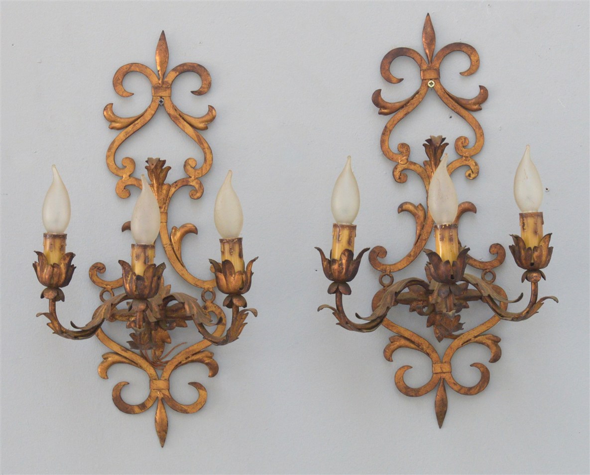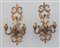 Lotto 3702 | Coppia di appliques a tre luci in metallo dorato a volute e motivi fogliati (cm