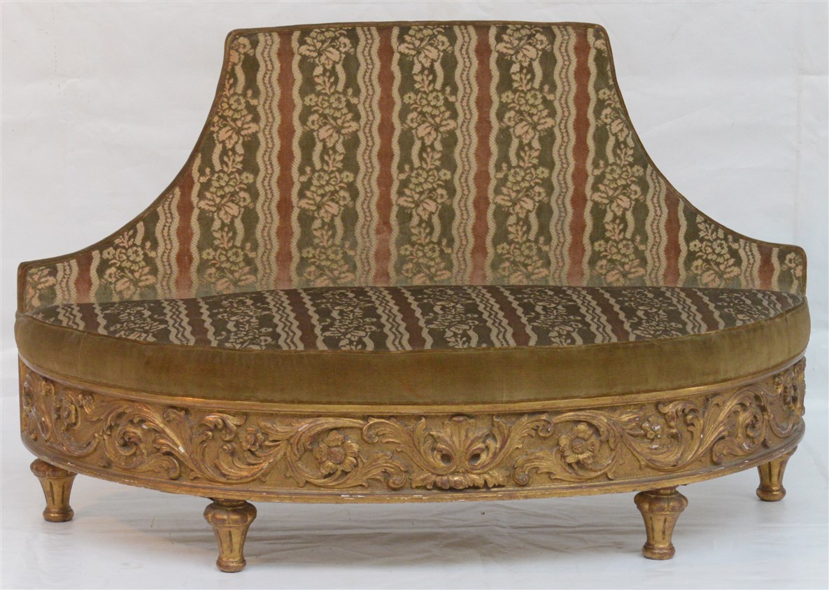 Divanetto da centro in legno intagliato e dorato a fiori e foglie, seduta a mezza luna e schienale sagomato. Rivestito in tessuto operato a fiori. Secolo XIX (difetti)