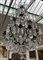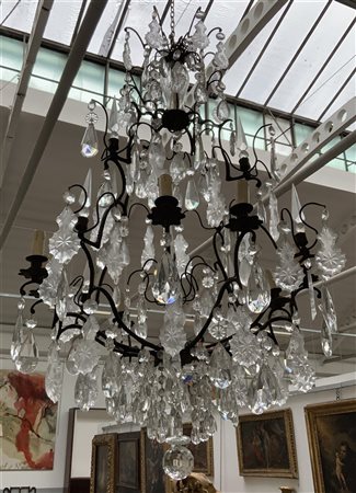 Lampadario a cesto con struttura in metallo ad otto fiamme decorato a pendenti e gocce in vetro molato (h. cm 120) (difetti)