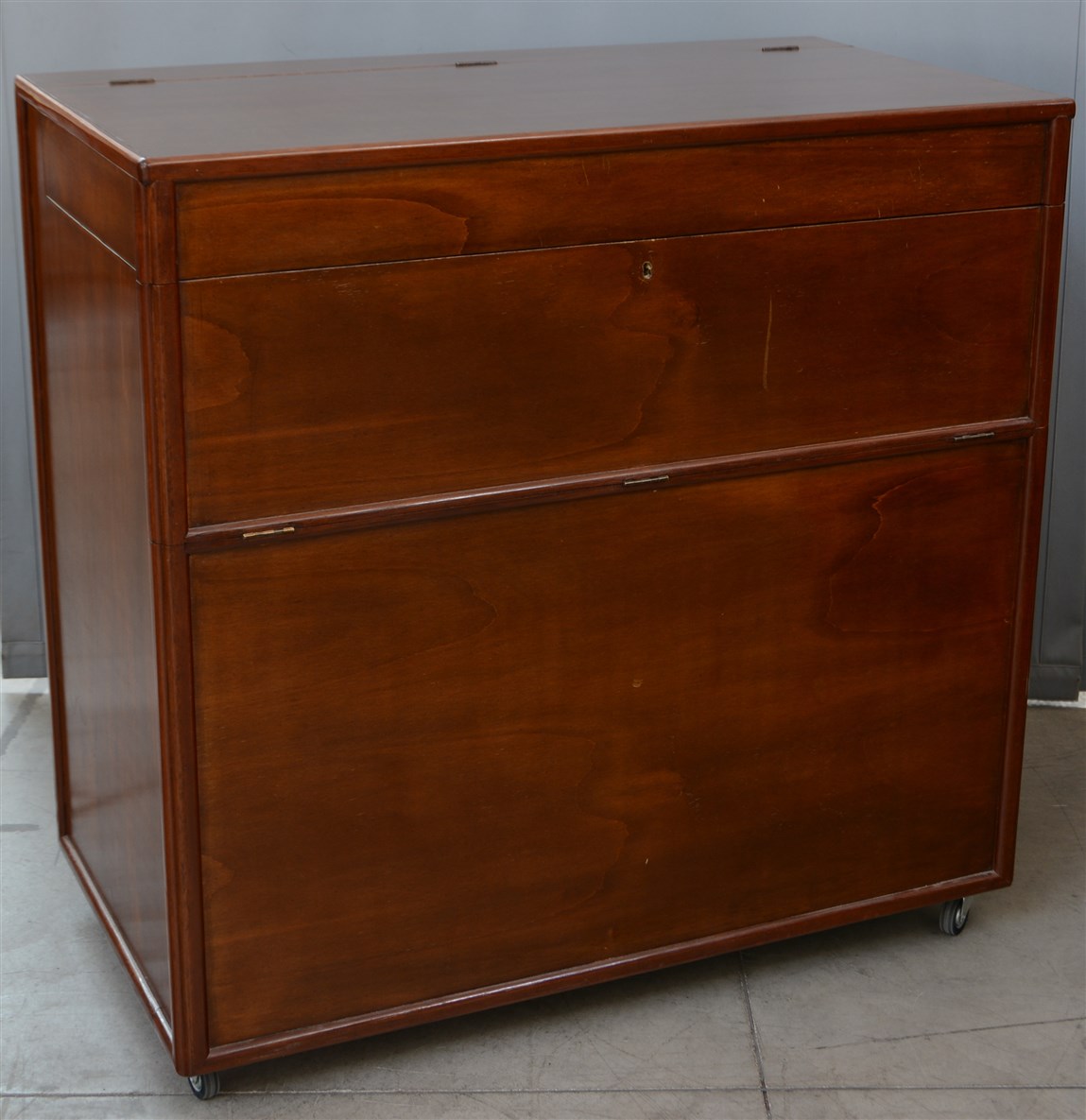Baule con piano sollevabile e fronte con sportello ribaltabile, munito di rotel