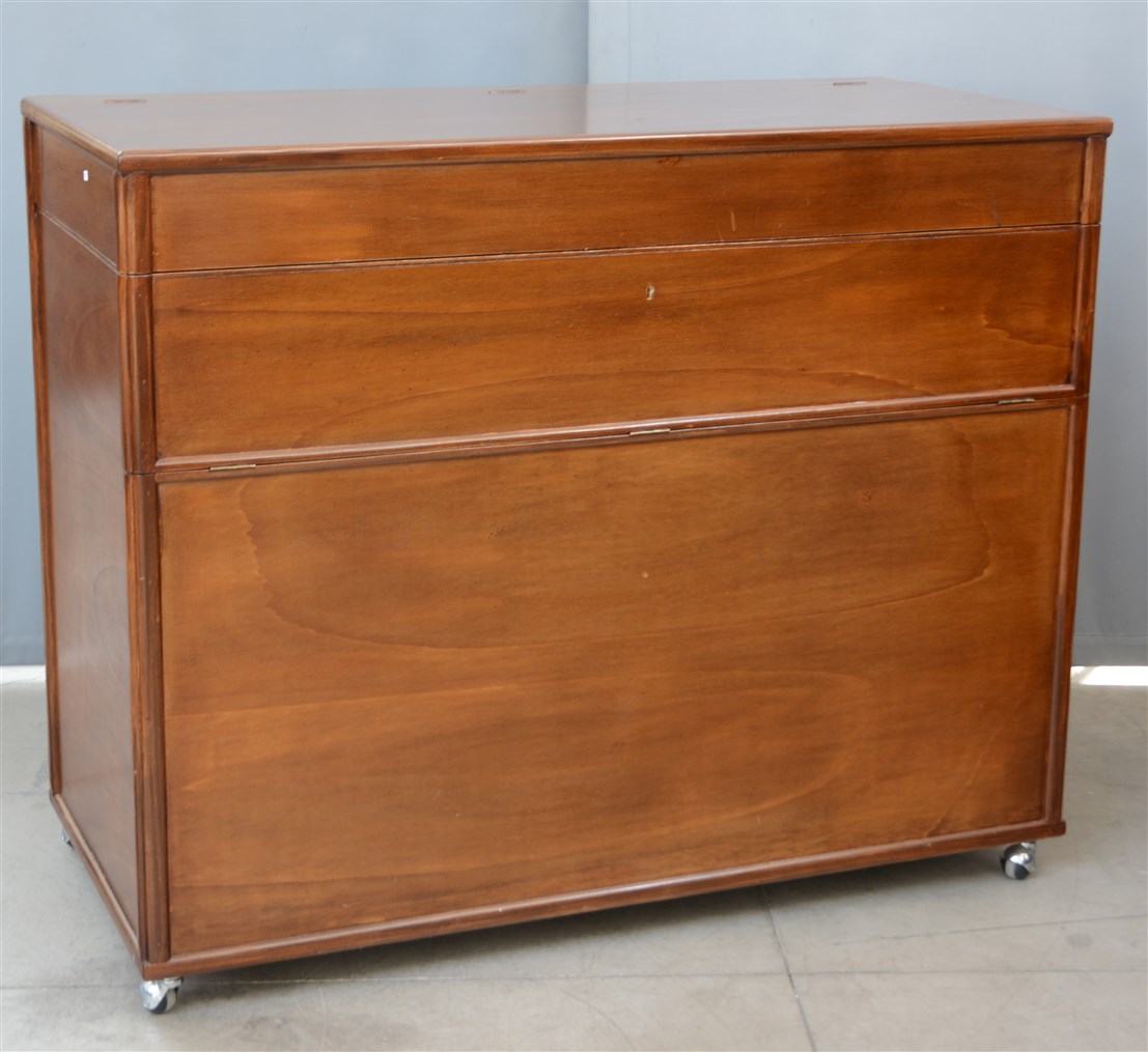 Baule con piano sollevabile e fronte con sportello ribaltabile, munito di rotel