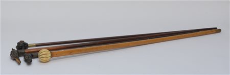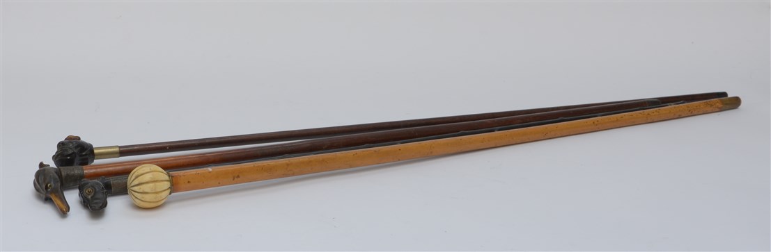 Lotto composto da tre bastoni con manici in legno intagliato a testa di cane ed uno con manico in avorio di forma sferica (difetti)