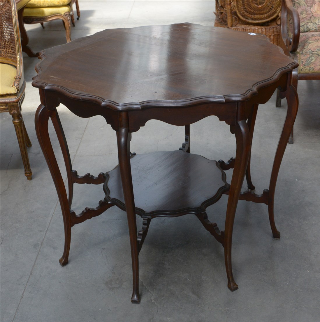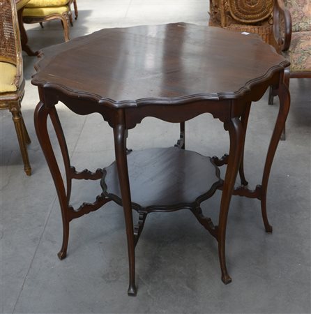 Tavolino da centro con piano ottagonale e gambe mosse riunite da un piccolo piano d'appoggio (cm 84x70x84) (difetti)