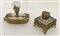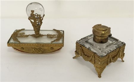 Lotto composto da un calamaio e un tampone per inchiosto in cristallo e metallo dorato con decori a figure e festoni (difetti)