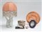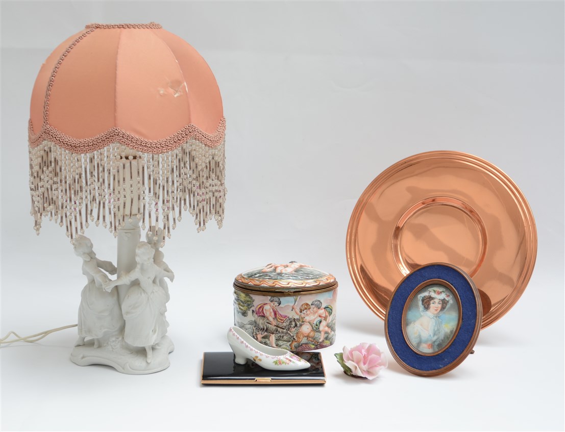 Lotto composto da una abat-jour da comodino, una scatola portagioie e due oggetti in ceramica uniti ad una miniatura, un piattino in rame ed un portasigarette in metallo (difetti)